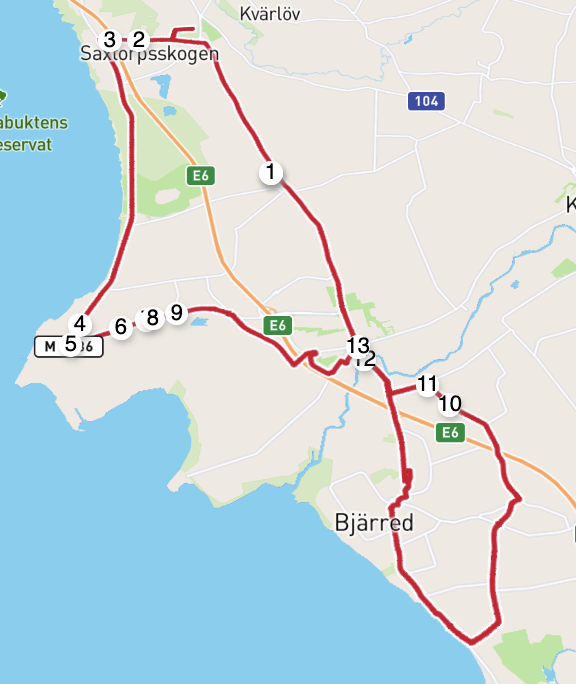 Torsdag 23 april. Varmt och fint vårväder förutom det vanliga blåsandet. En fick nordvästan fick man ta vid hornen idag. Elitaren rullade iväg mot Saxtorp och undrade hur det skulle gå. Något oförklarligt ont i vänster vad. Det bara kom under dagen utan att något konstigt hade inträffat. Kicken hade meddelat att han lag upp rundan för dem och kände ett ansvar för att visa vägen. När Elitaren kom till Saxtorp var det tomt och öde där. Men å andra sidan var han ute i god tid. Strax innan sexslaget kom Barne farande. Nu hade han alltså kommit ut ur vinteridet! Nu väntade man bara på Bokis. Men det kunde ju vara så att han var sen idag då det var motvind från Kävlinge mot Saxtorp. När klockan var fem över sex rullade man iväg på 104:an för att möta upp Bokis om han kom där.
